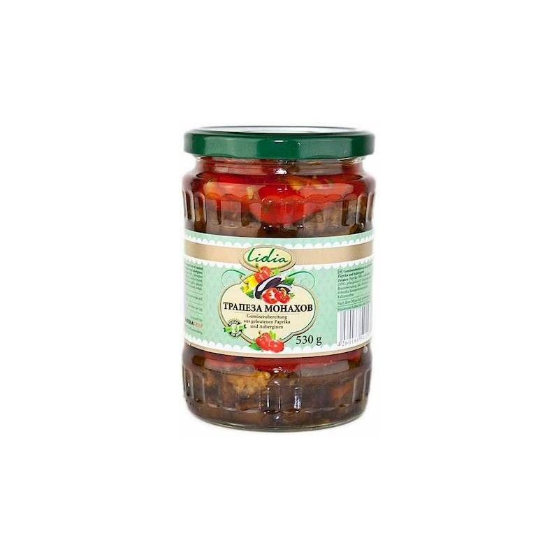 Il "Pasto dei Monaci" è un antipasto delizioso. I peperoni e le melanzane alla griglia sotto olio è un contorno o antipasto pronto, salutare e sempre a portata di mano. Il prodotto è preparato con le verdure di alta qualità secondo la ricetta tradizionale, è un piatto freddo a base di prodotti naturali: peperoni, melanzane, aglio, prezzemolo, olio di semi di girasole, spezie ed erbe aromatiche, cucinati alla griglia. L'insalata viene servita come antipasto per il piatto principale. Il prodotto contiene un'enorme quantità di vitamine e minerali.